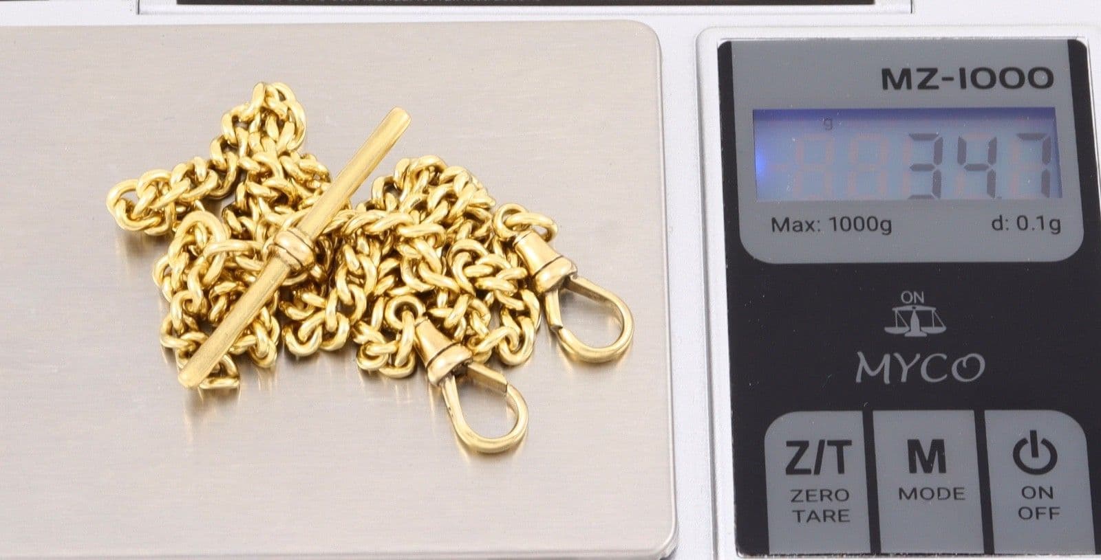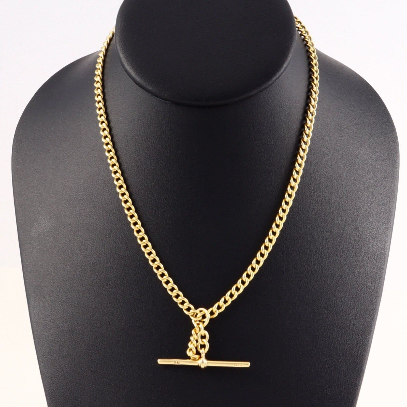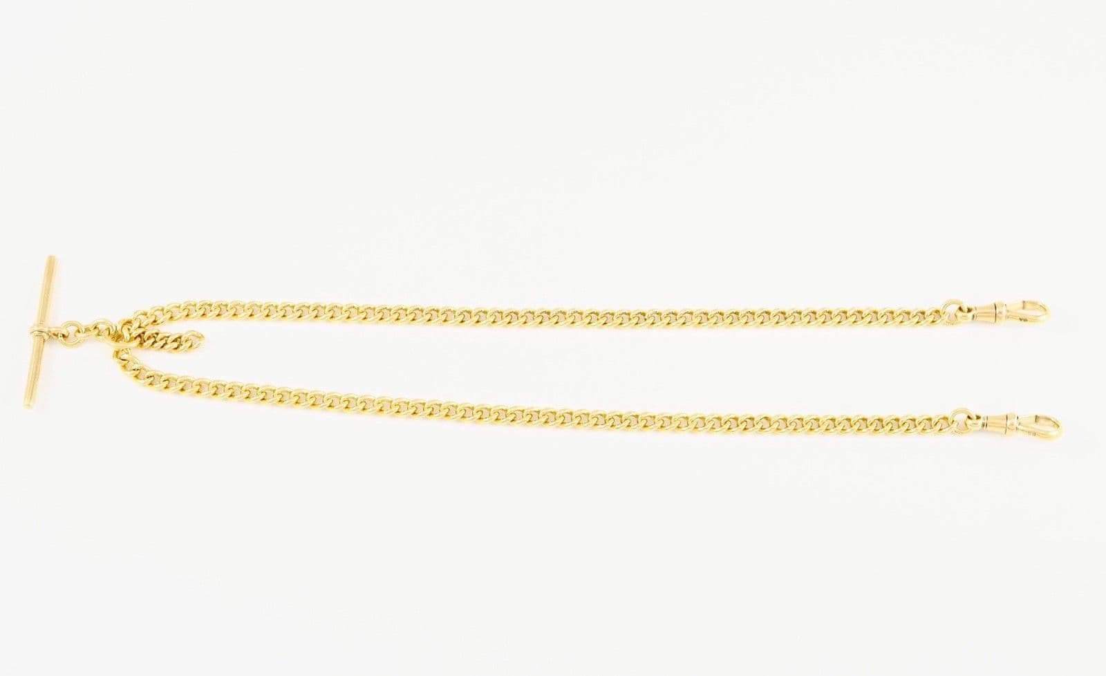 The chain links, dog clips and T-bar have mark 18 and crown for 18 carat gold.