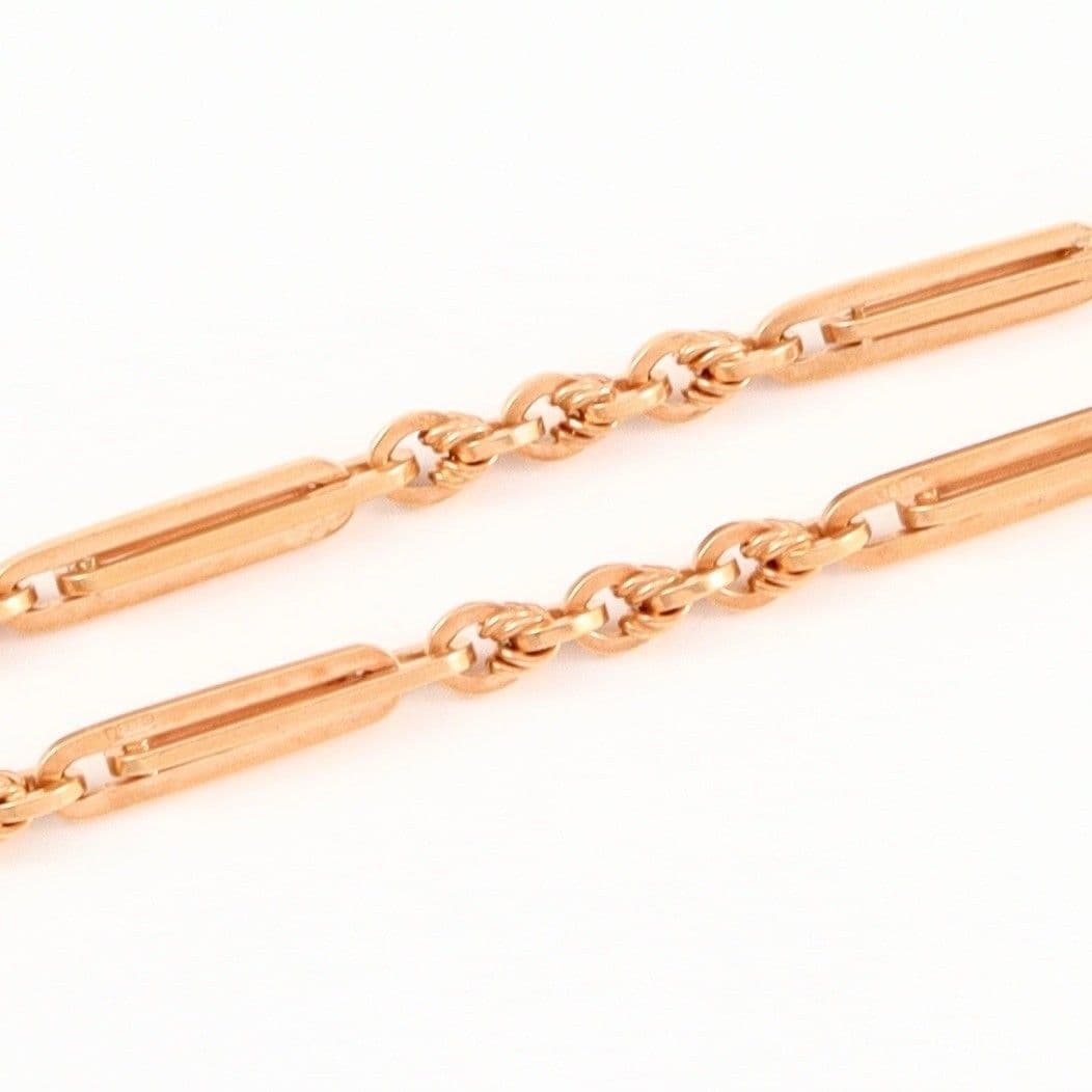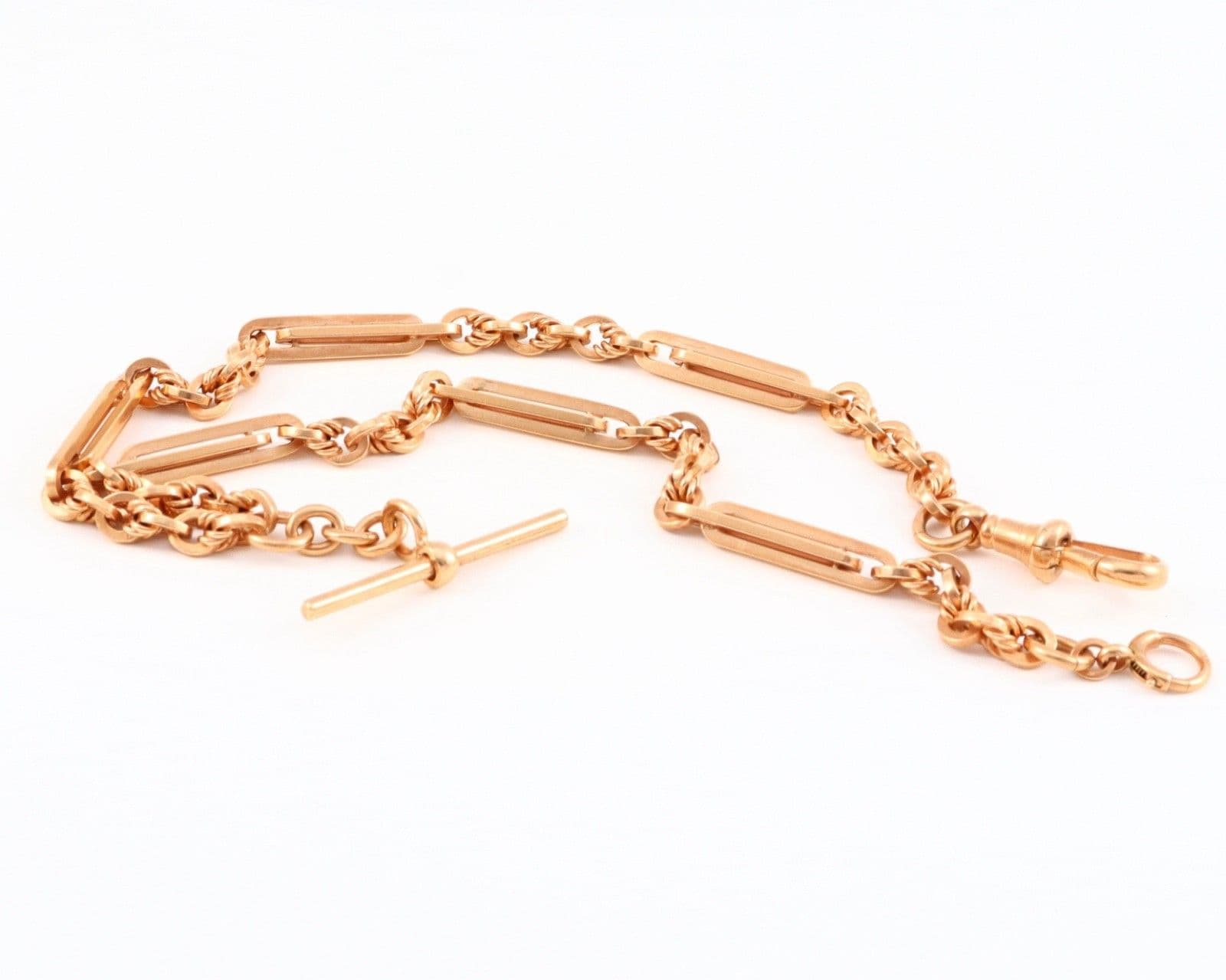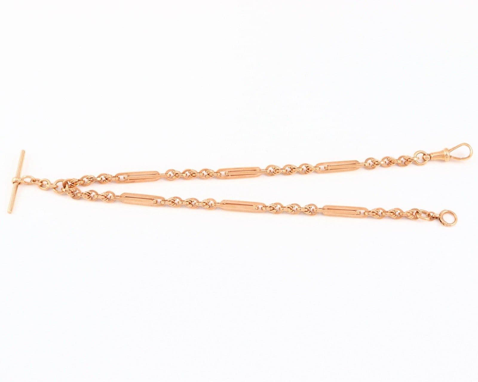 Antique 9 carat rose gold trombone and love knot link double Albert watch chain.