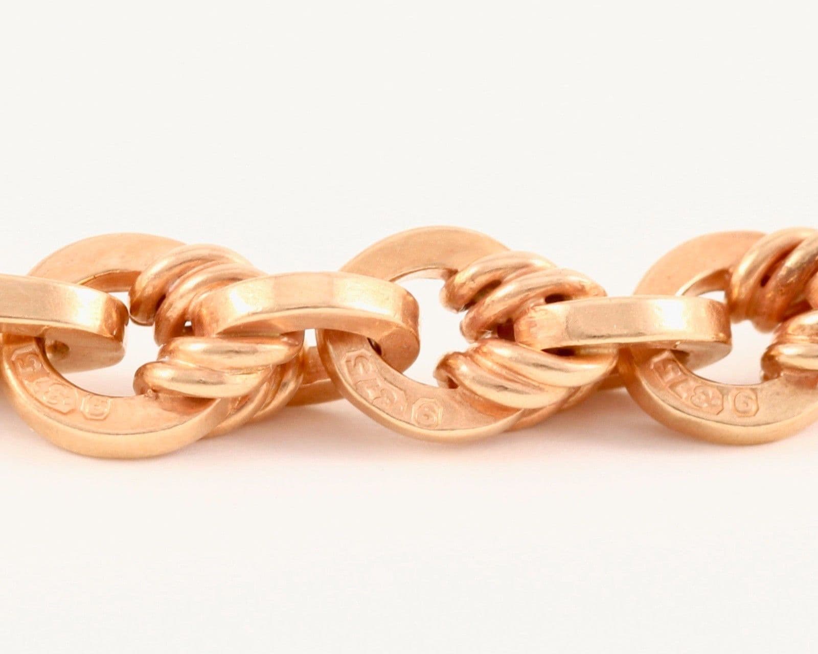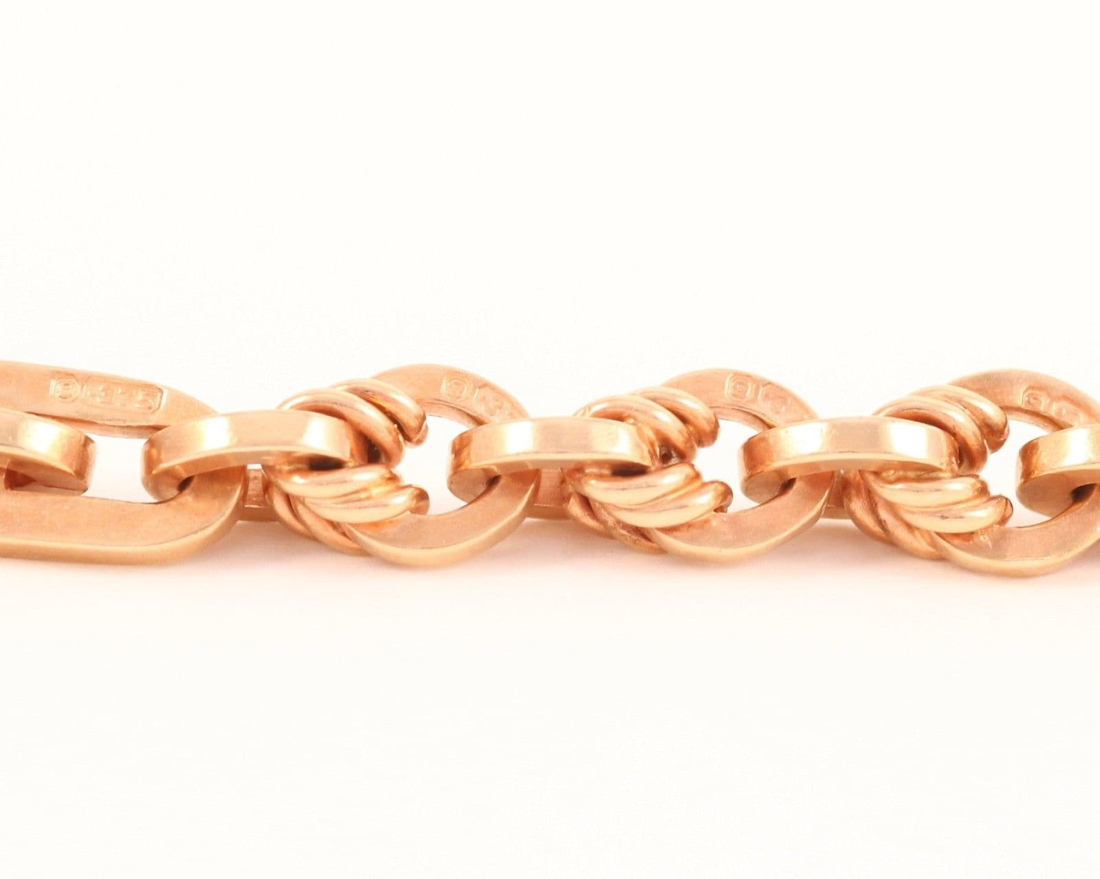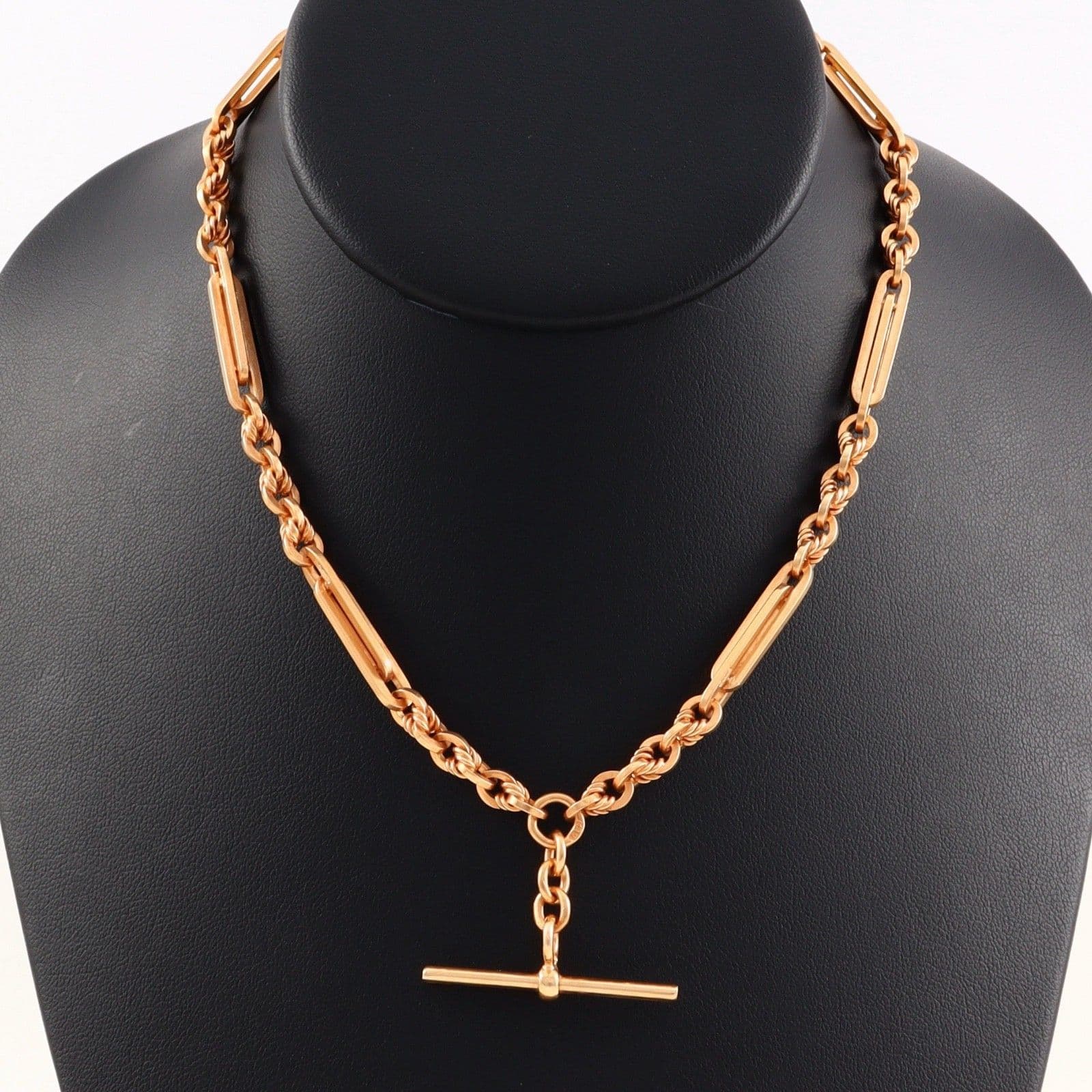 Antique 9 carat rose gold trombone and love knot link double Albert watch chain.