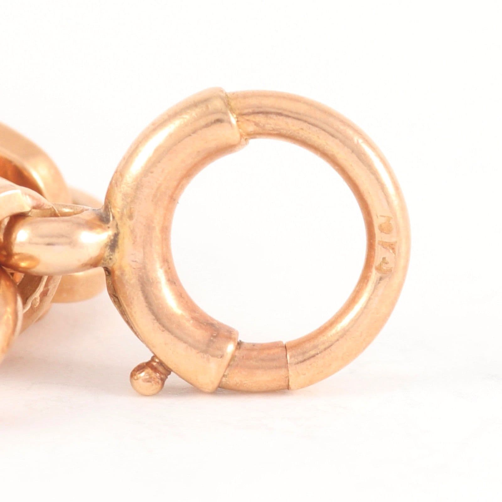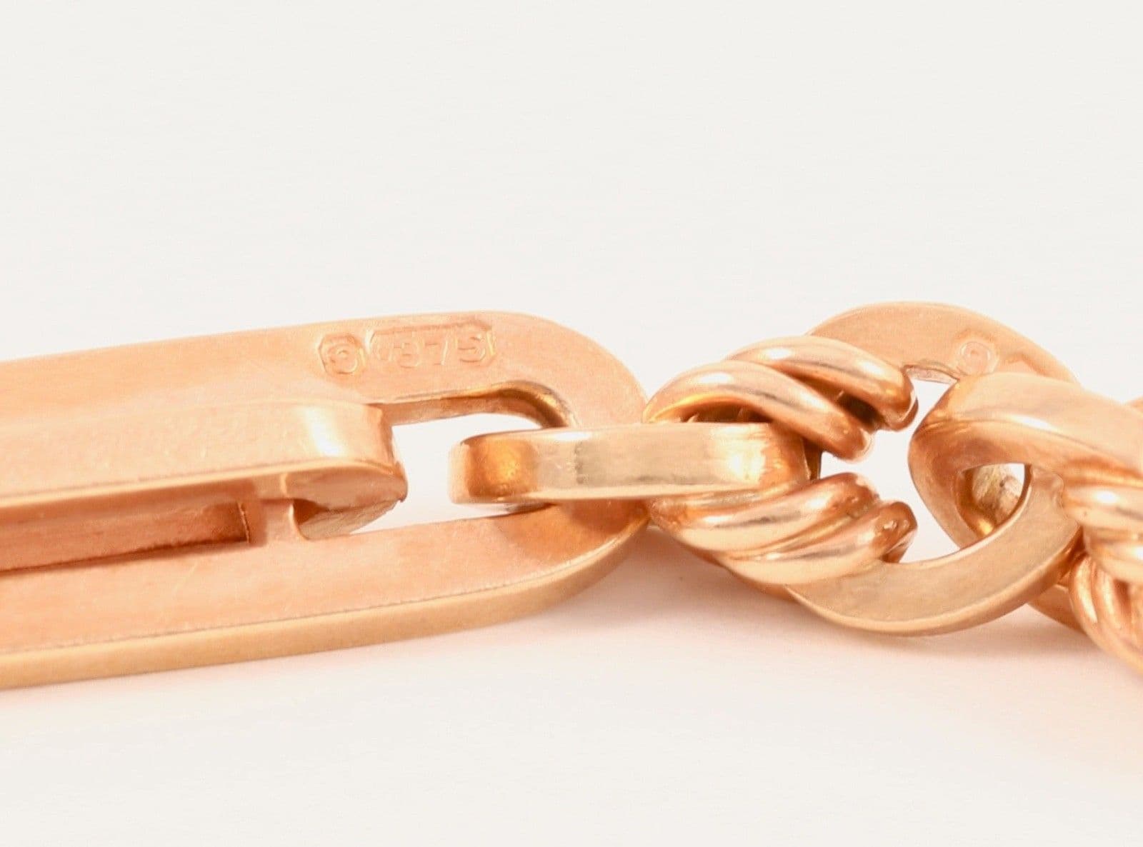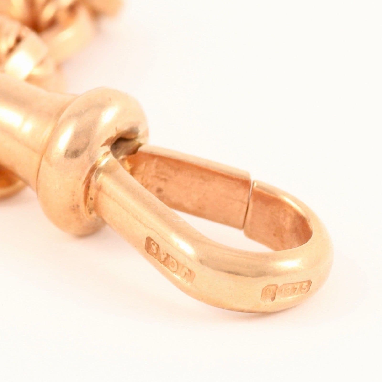 The chain links, dog clip and bolt ring are marked for 9 carat gold. The T-bar is unmarked but has been tested for 9 carat gold. The chain has Birmingham hallmark and date letter for 1920.