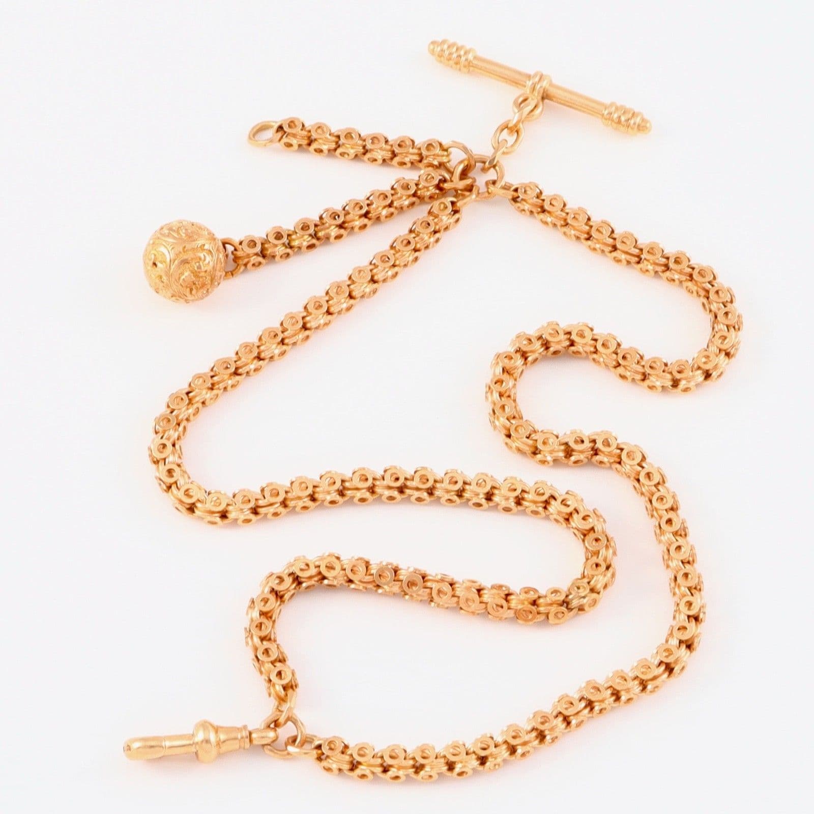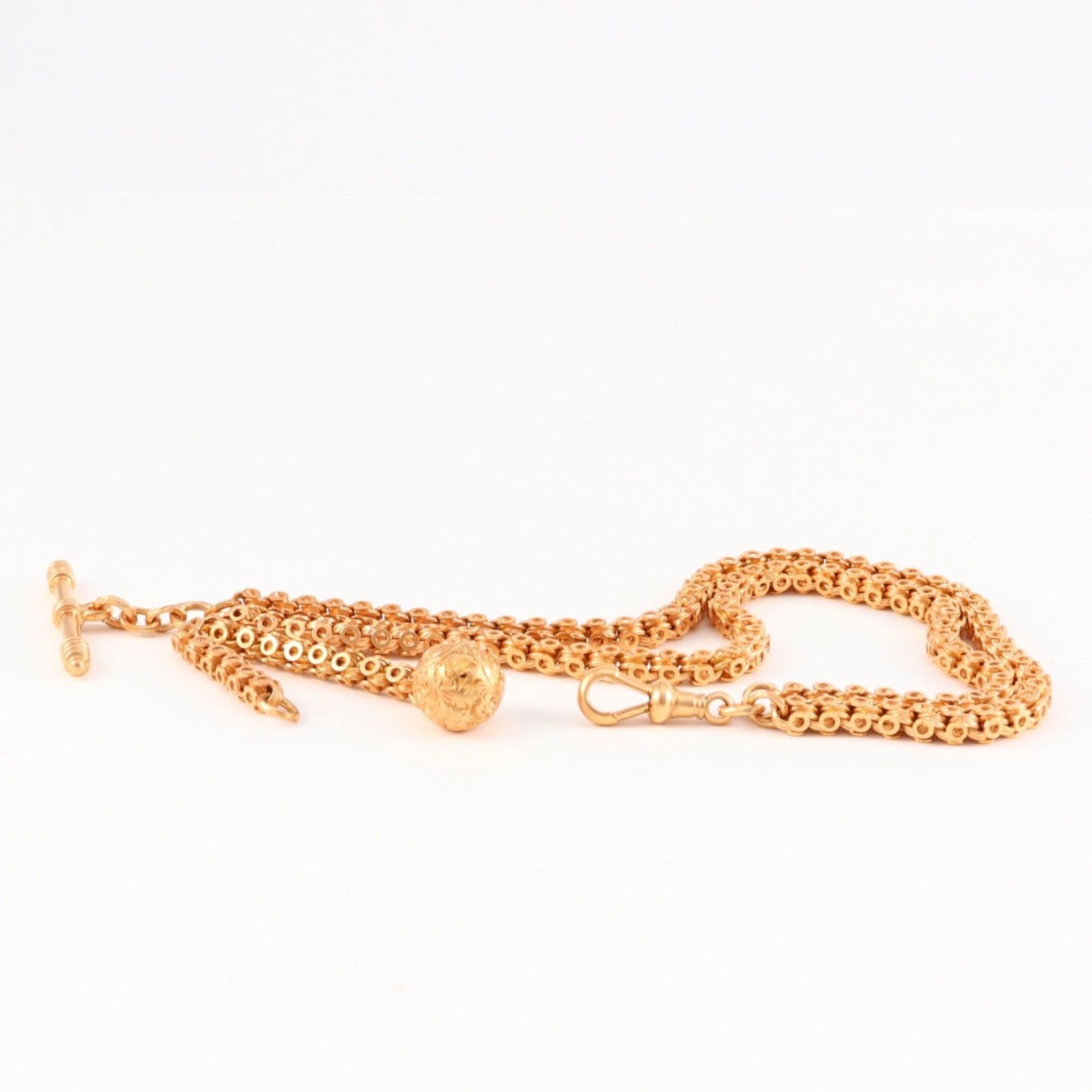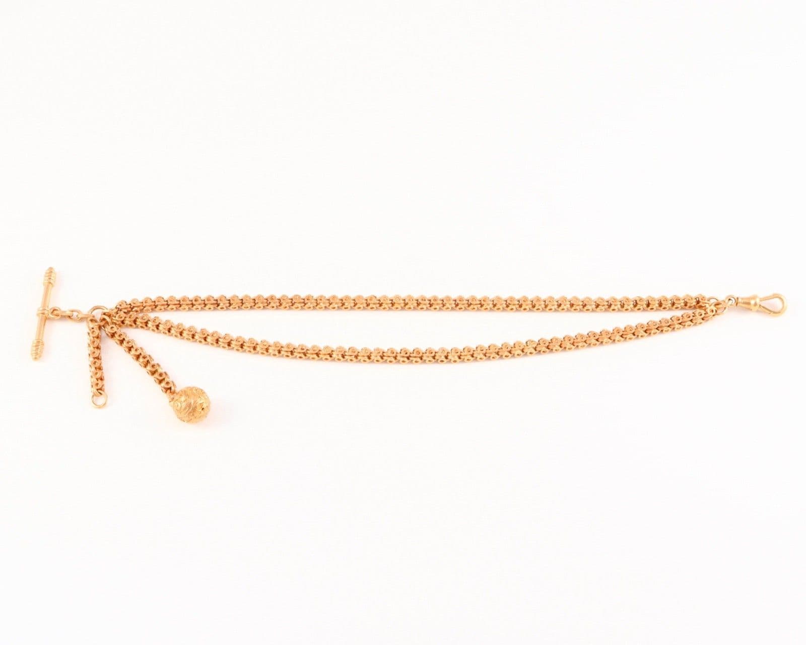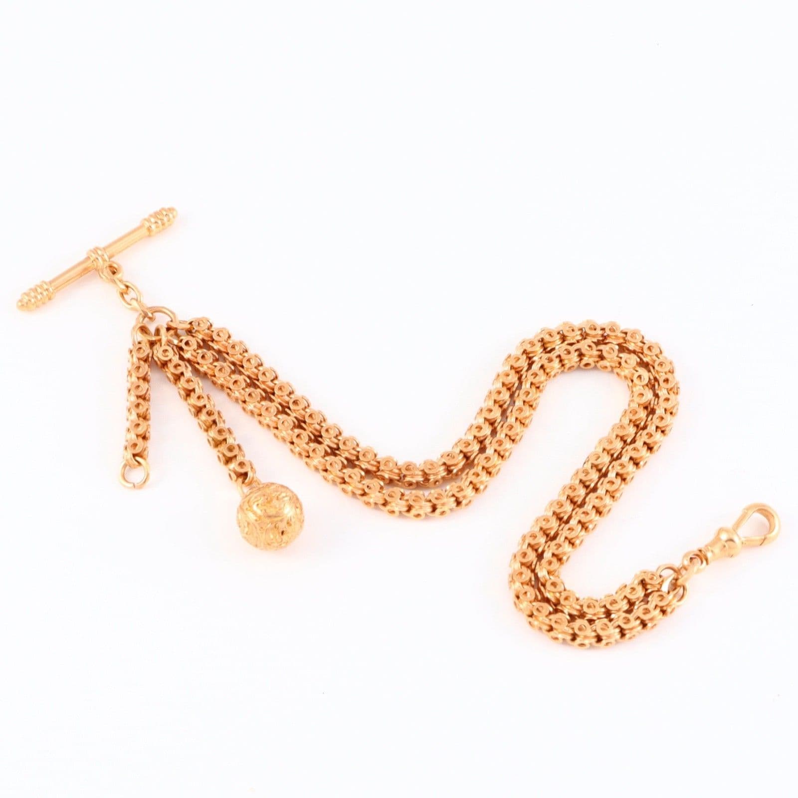 We have for sale antique Victorian 9 carat rose gold Albertina watch chain with fob ball c 1890's. The ball has chased pattern around.
