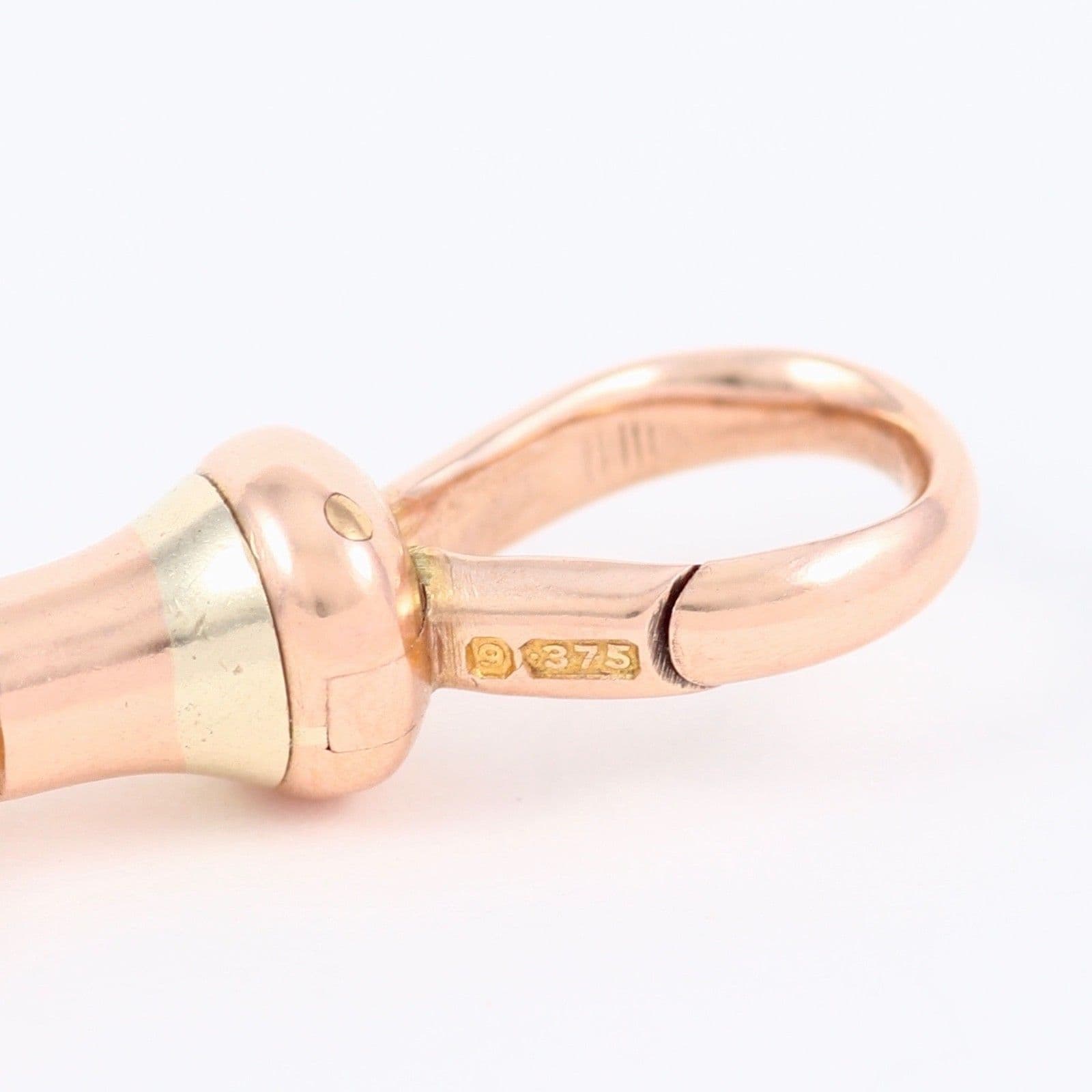The chain links, dog clip and T-bar are marked for 9 carat gold. The chain has Chester hallmark and date letter for 1913. The T-bar and chain have the same maker's mark JBS.