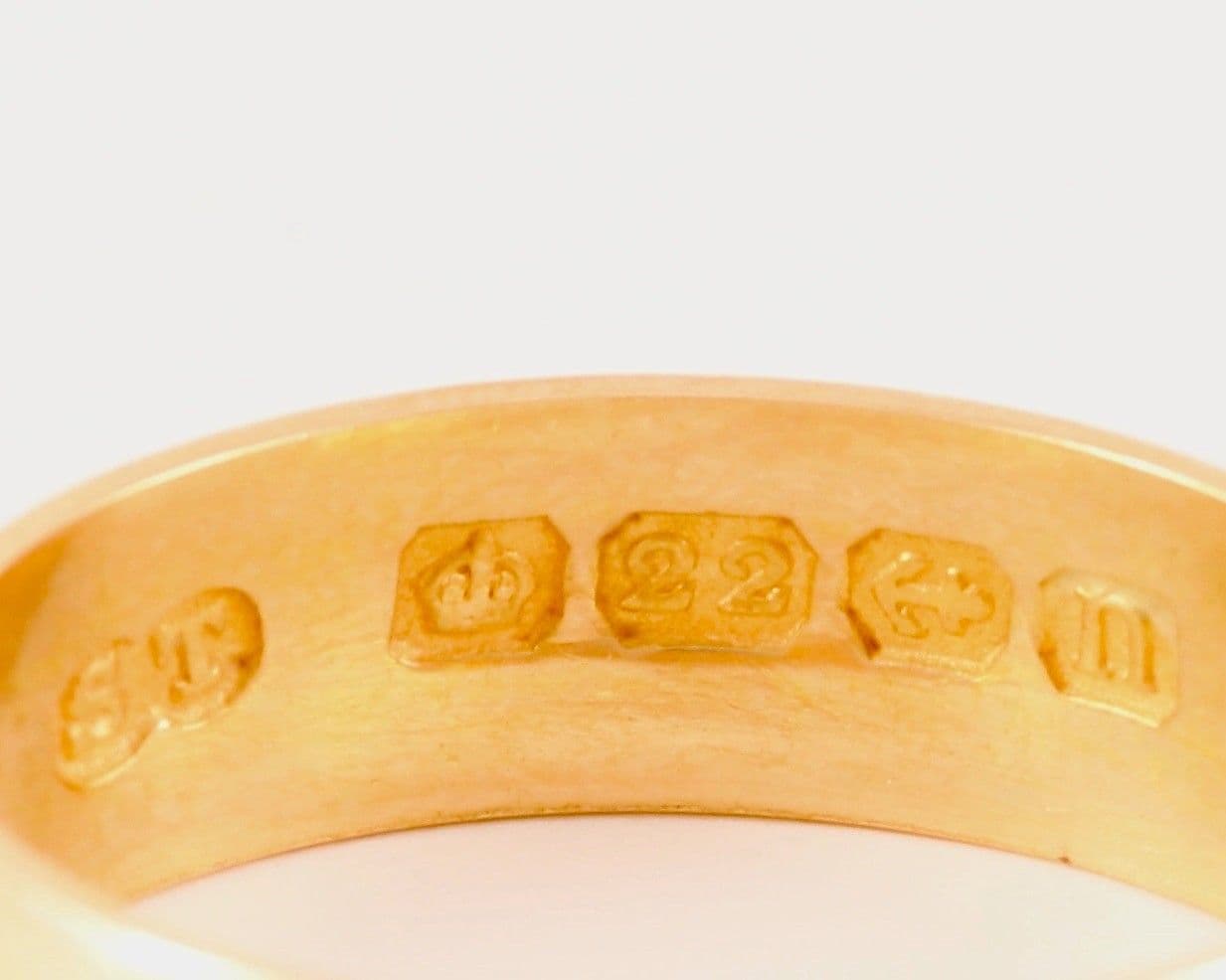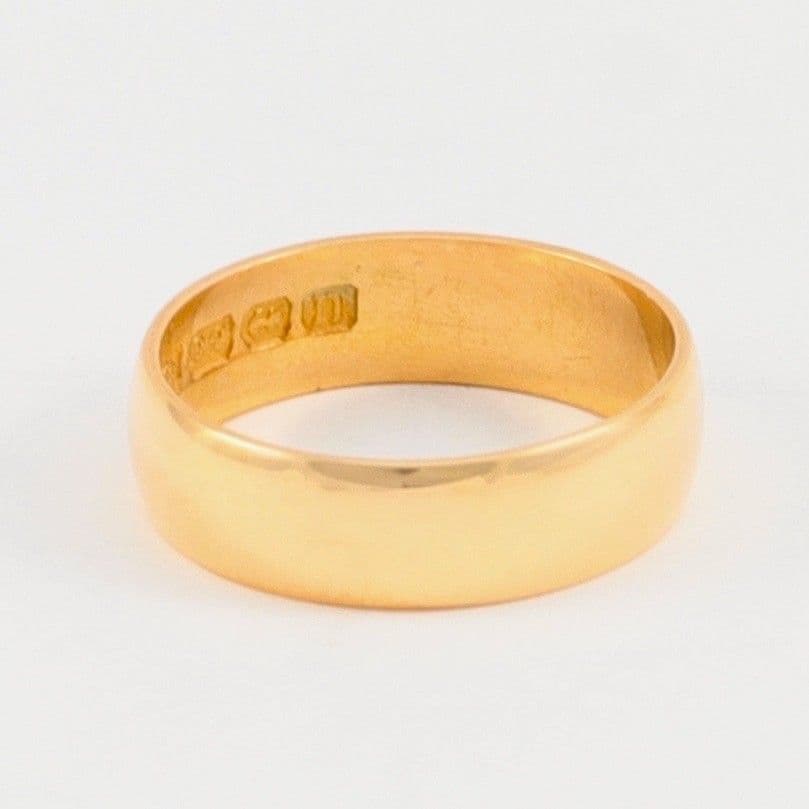 We have for sale this antique solid 22 carat yellow (with rose hue) gold wedding band / ring.The ring has Birmingham hallmark 22 for 22 carat gold and date letter for 1912.