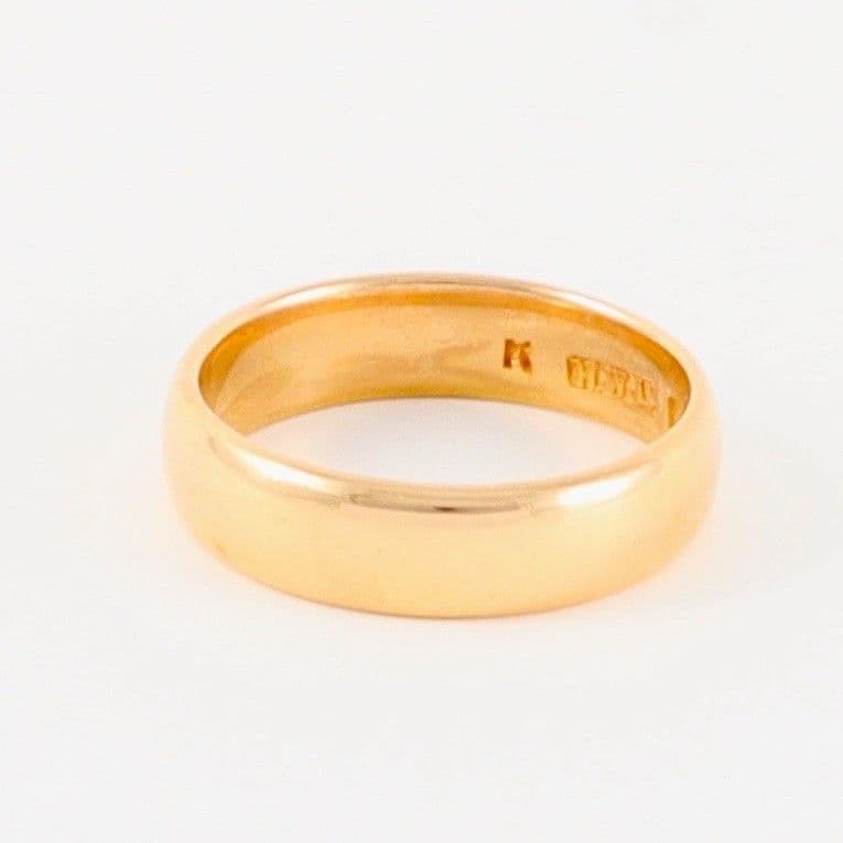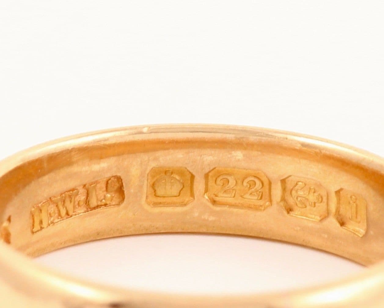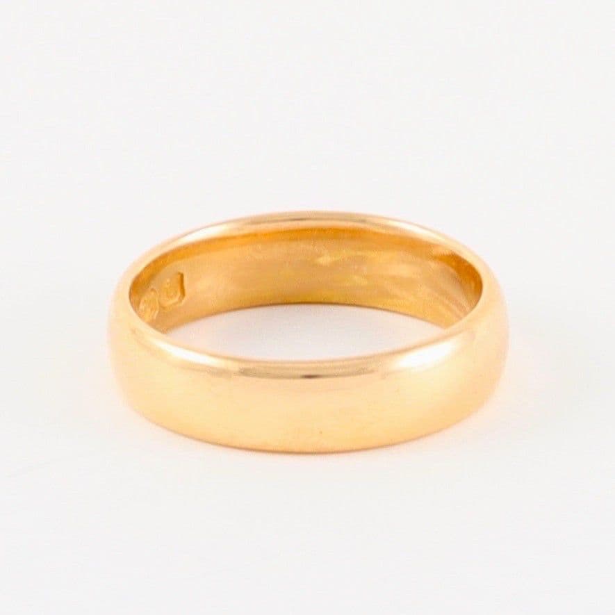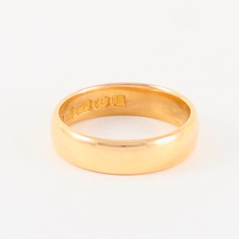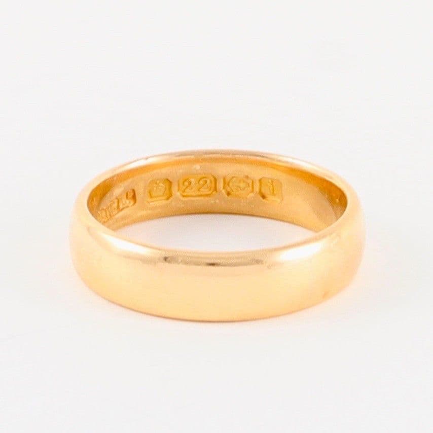 We have for sale this antique solid 22 carat yellow (with rose hue) gold wedding band / ring.The ring has Birmingham hallmark 22 for 22 carat gold and date letter for 1908.