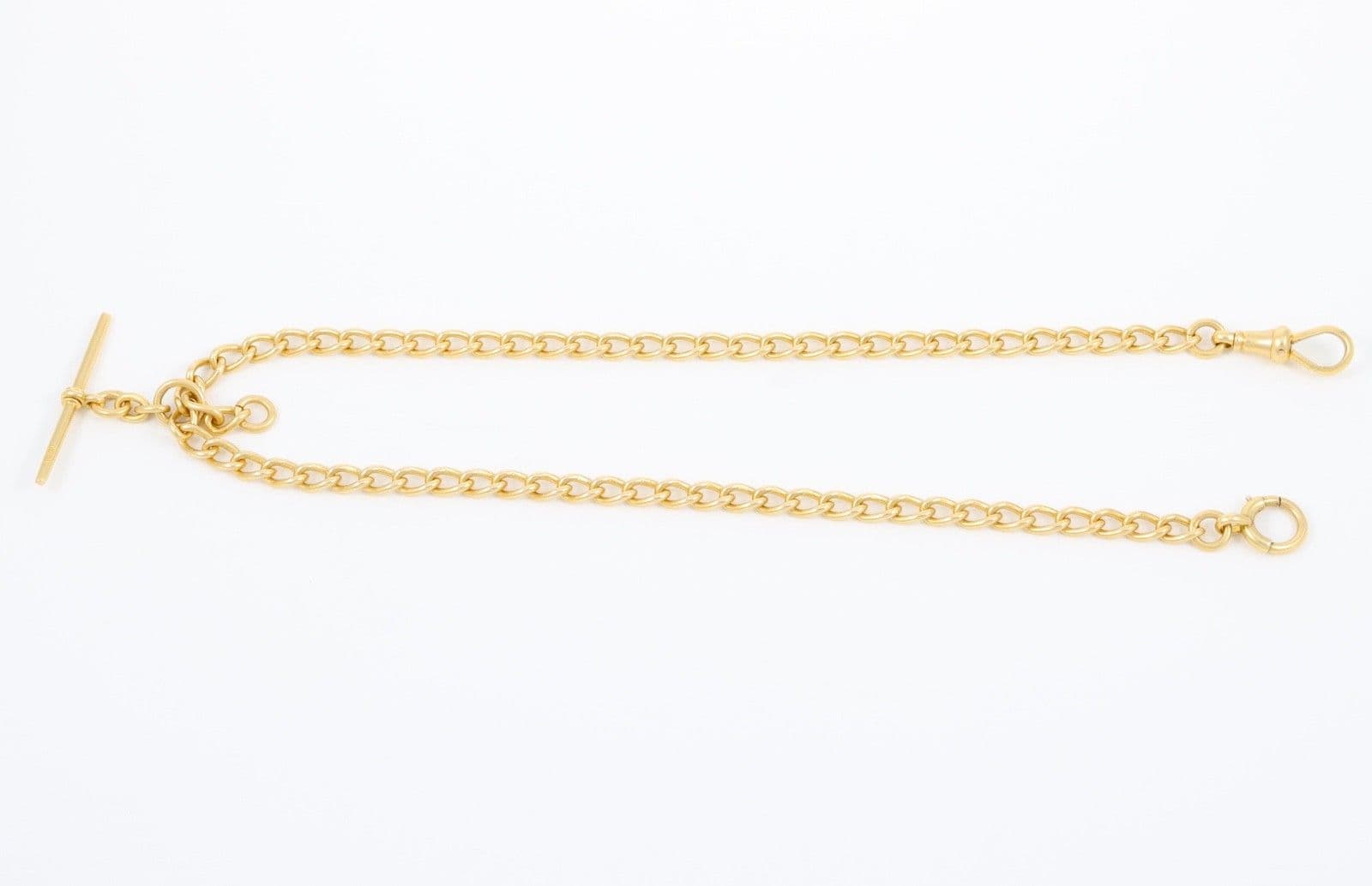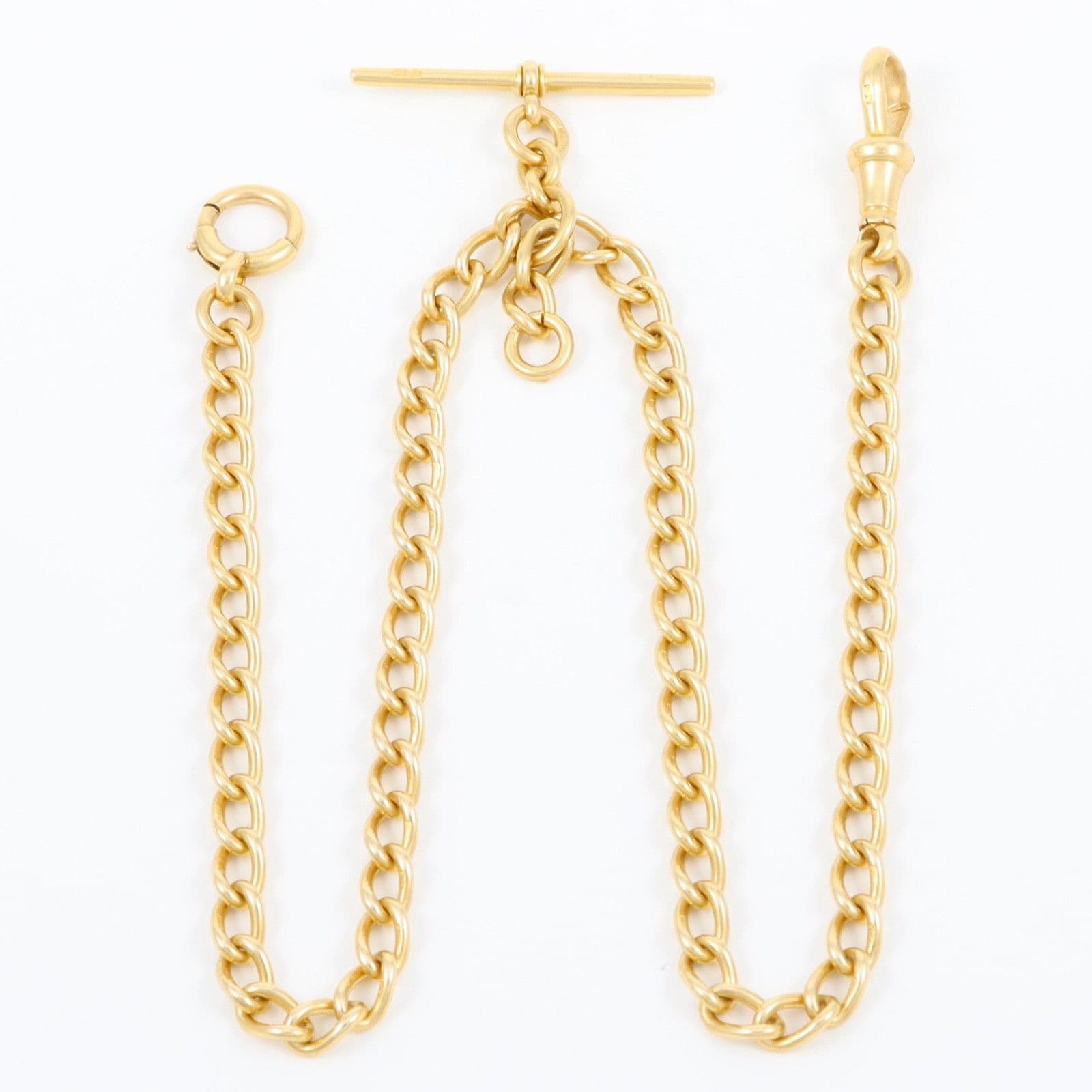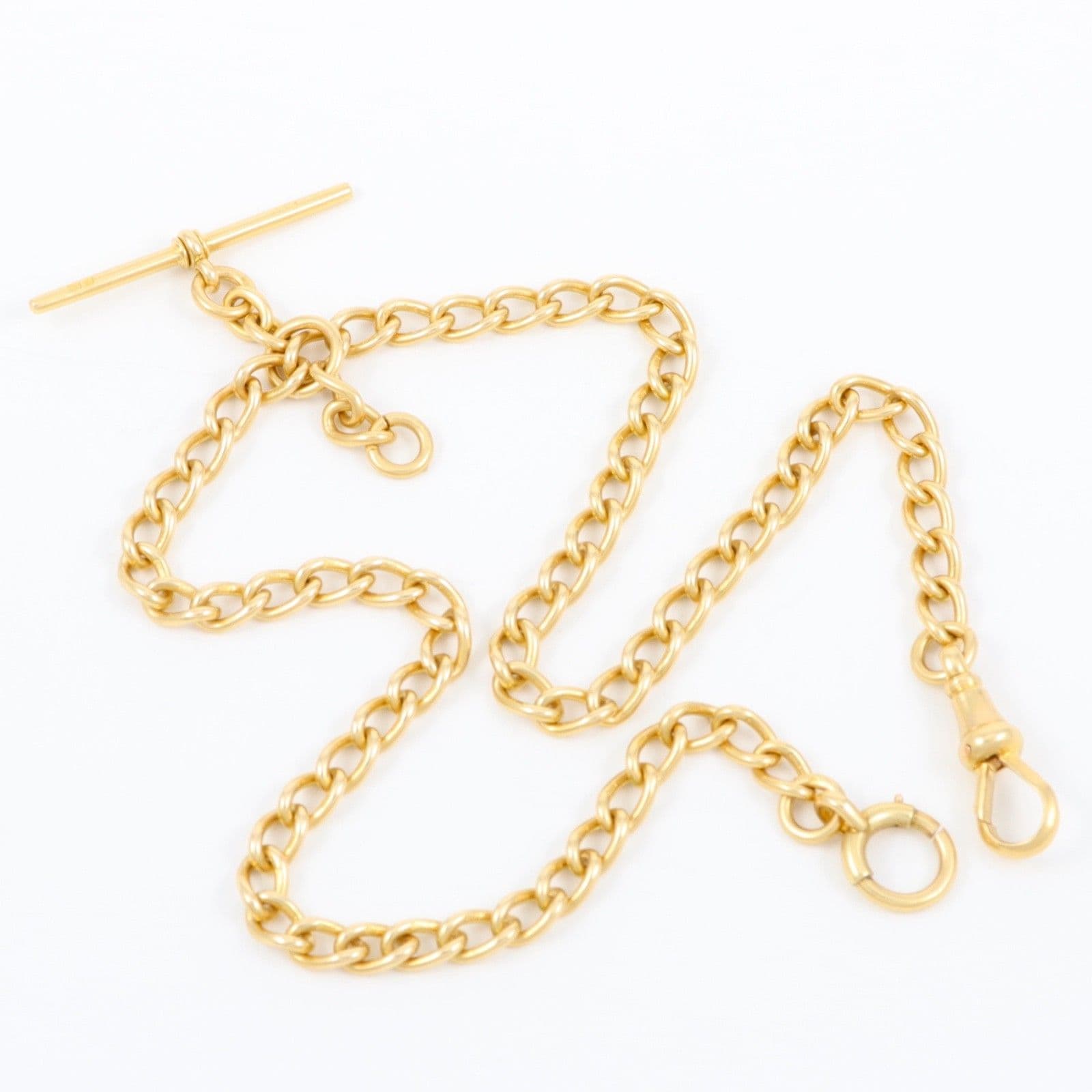 Antique solid 18 carat yellow gold oval curb link Albert watch chain with sliding T-bar, dog clip and bolt ring.