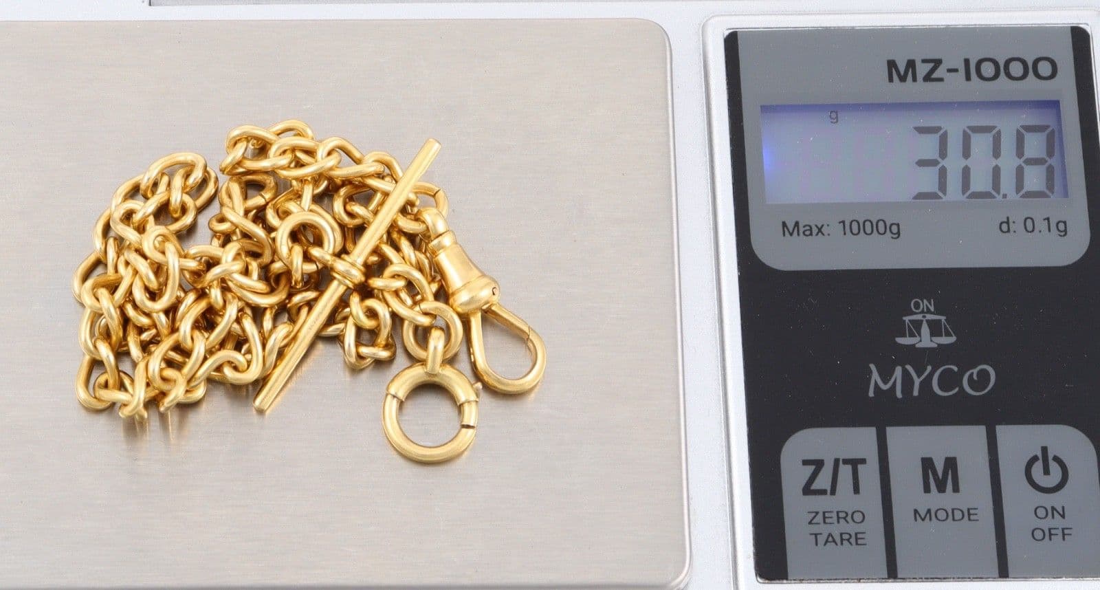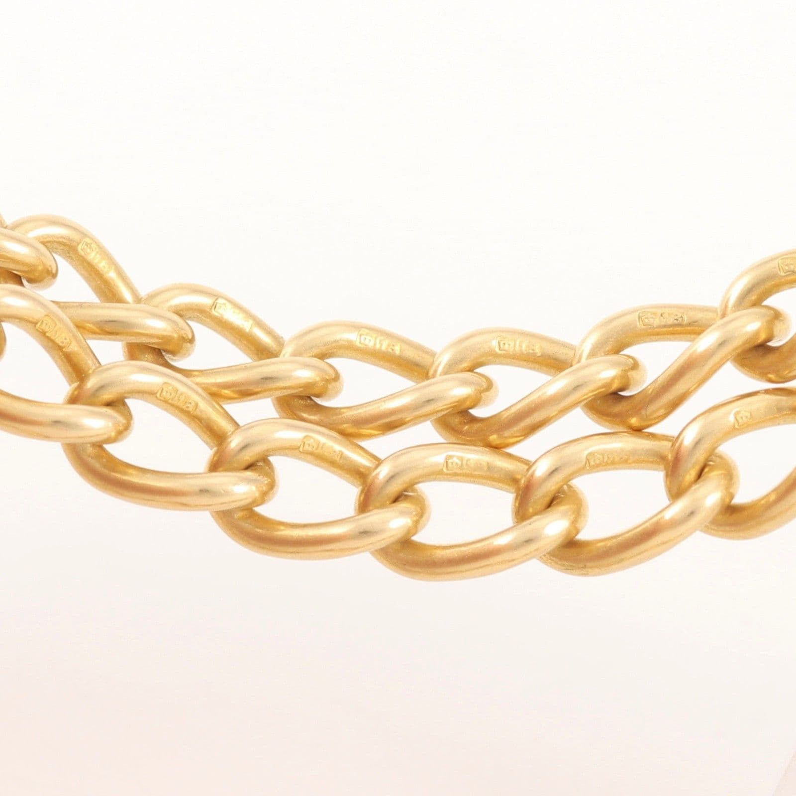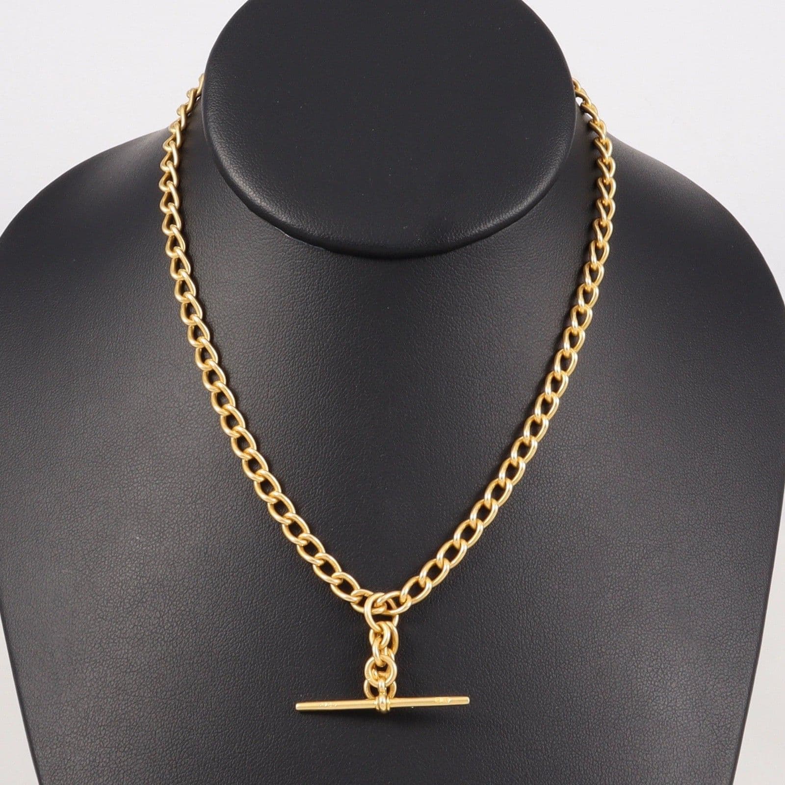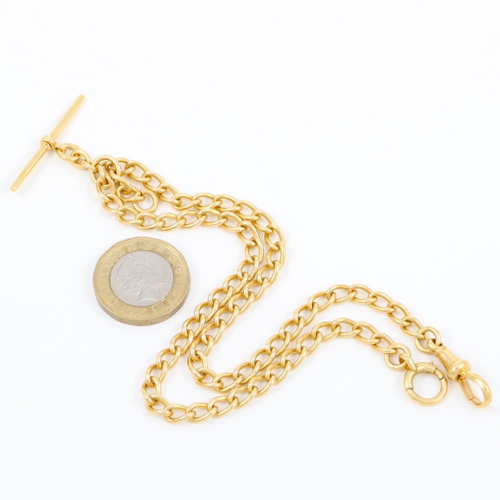 Antique solid 18 carat yellow gold oval curb link Albert watch chain with sliding T-bar, dog clip and bolt ring.
