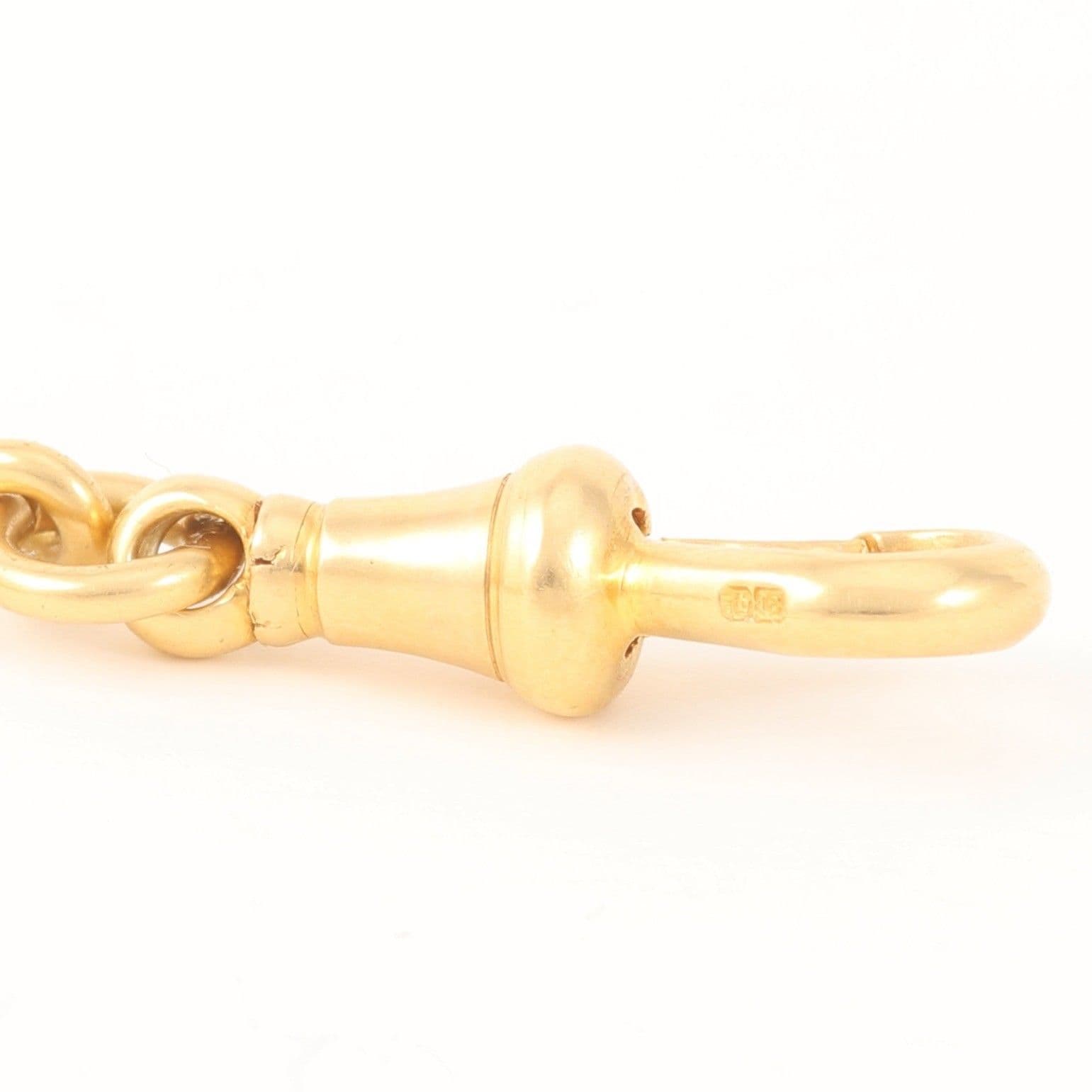 The chain links, dog clip and T-bar have mark 18 and crown for 18 carat gold. The bold ring has mark 18. The chain has Chester hallmark and date letter possibly for 1873 (please see photo).