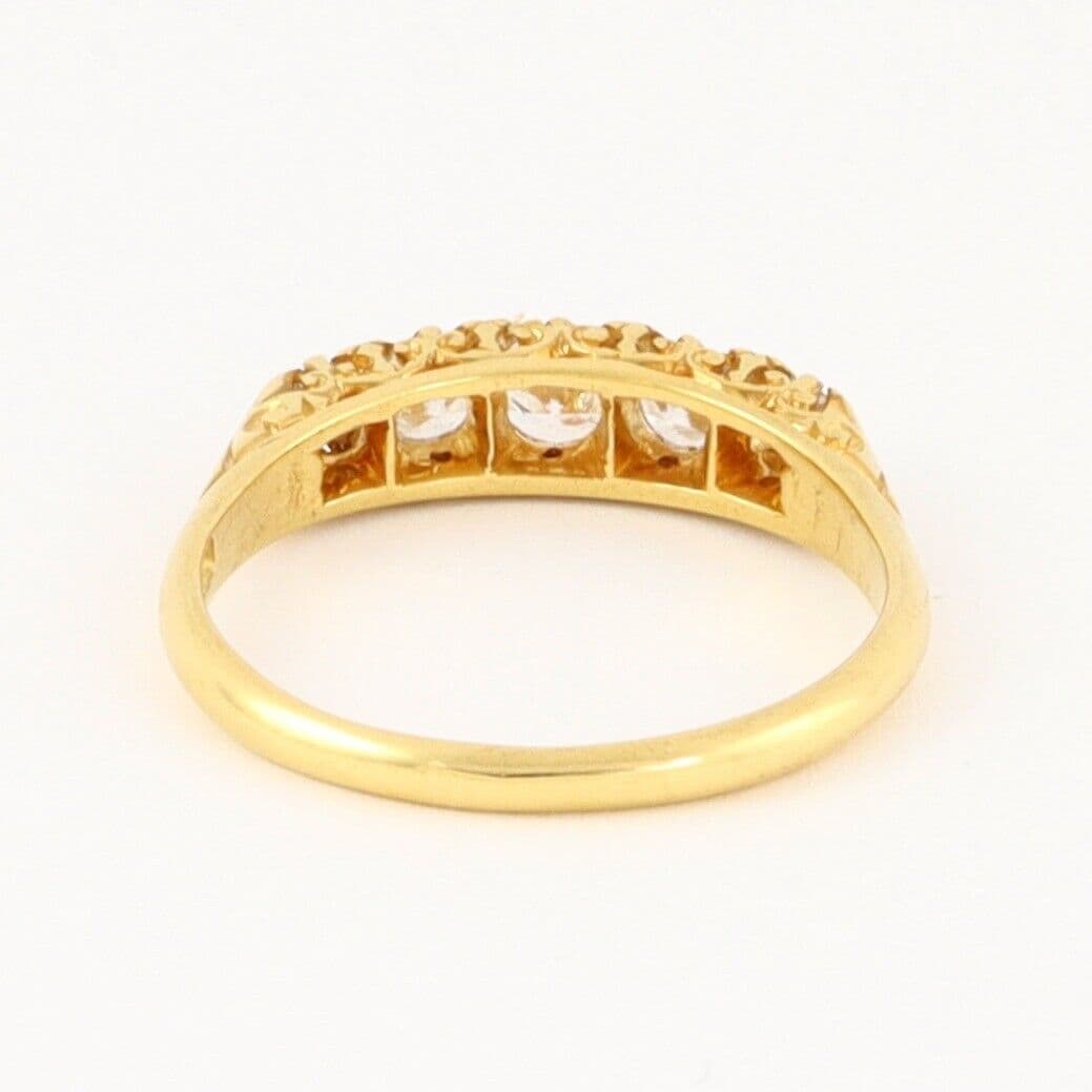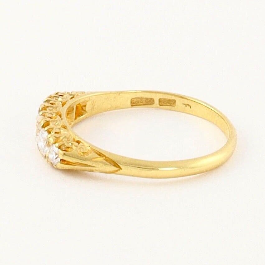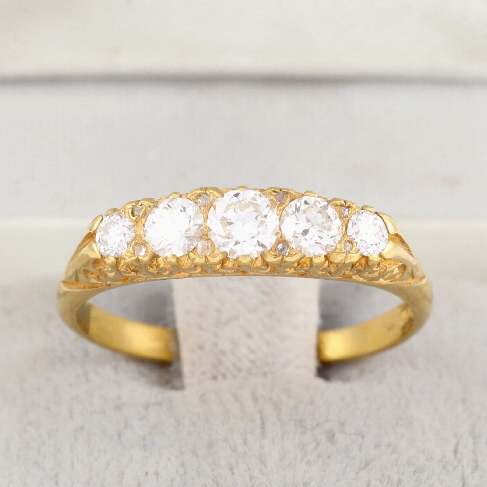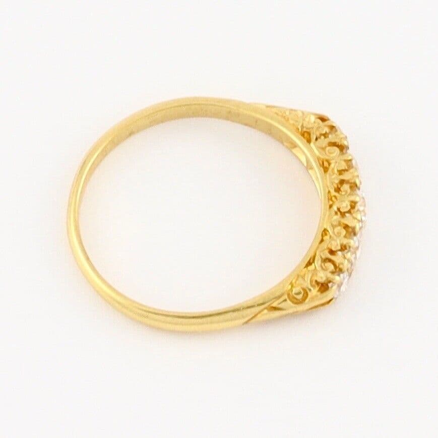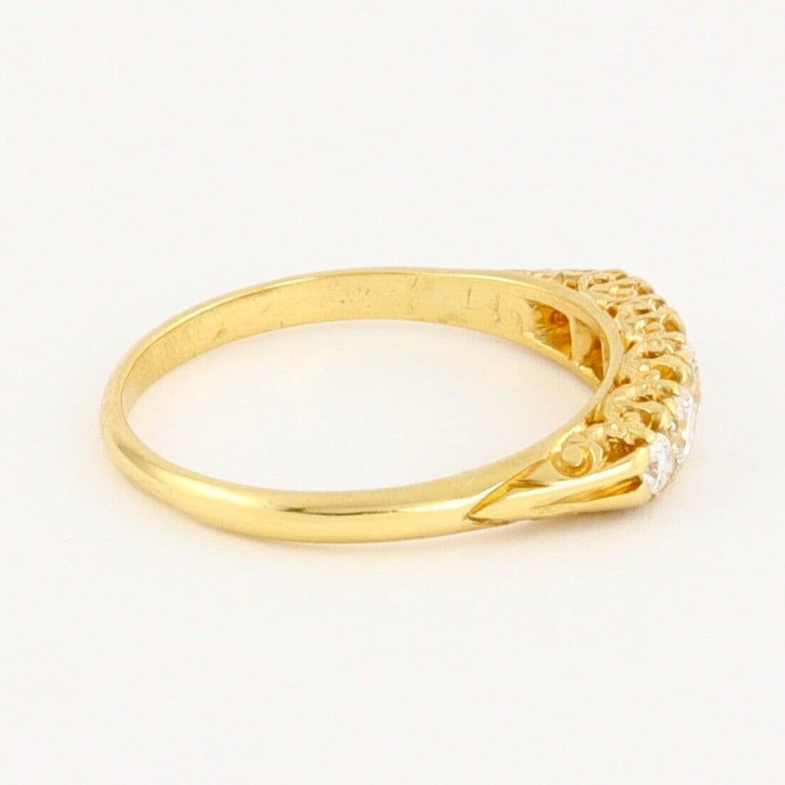 We have on sale this vintage 18 carat yellow gold ring set with five graduated round cut diamonds separated by pairs of tiny rose cut diamonds( the total quantity of rose cut diamonds is 8). The ring has mark 18CT for 18 carat gold . The face of the ring is approx. 4.4mm or 3/16'' at widest part. The diamonds are white, sparkly, very good clarity, eye clean. The central diamond is approx 0.25 carat, two diamonds 0.15 carat each and two diamonds 0.04 carat each by spread. The total carat weight 0.63 excluding the small rose cuts.