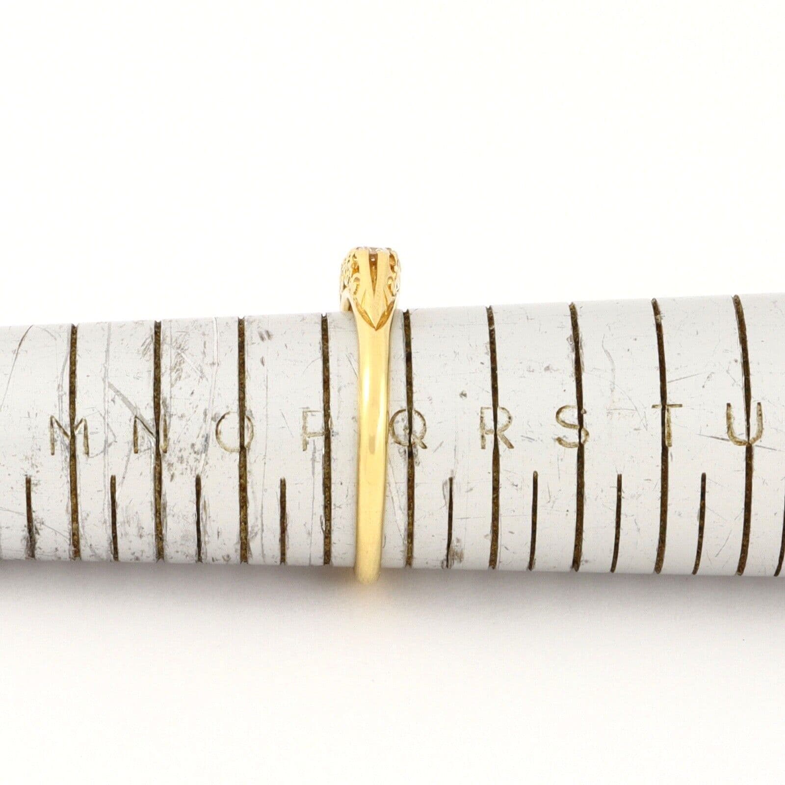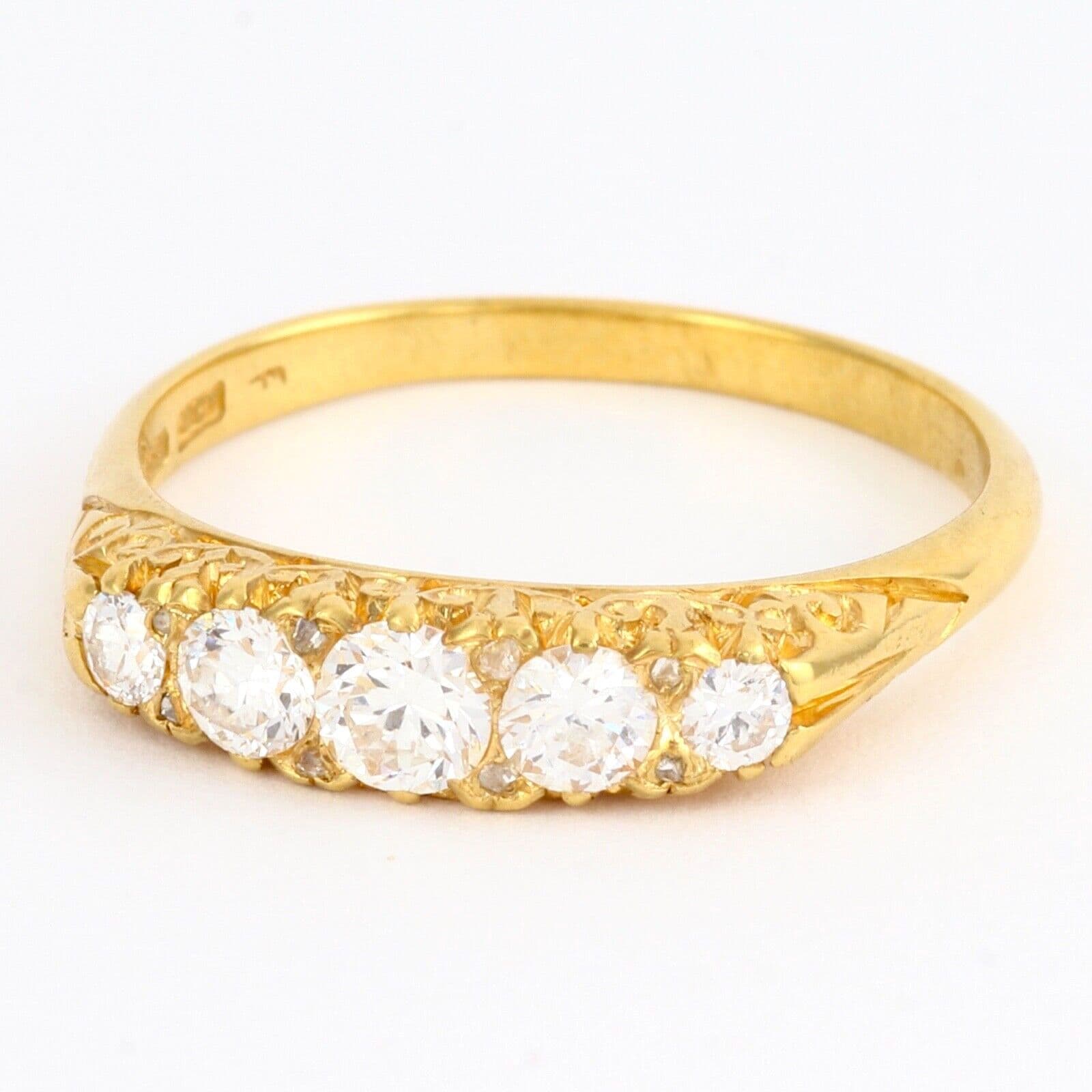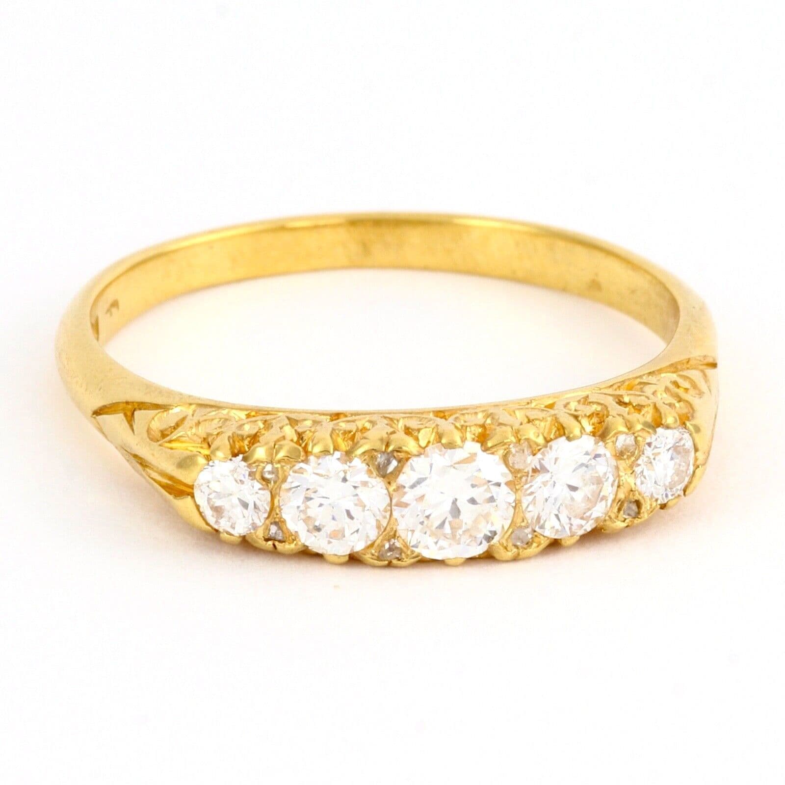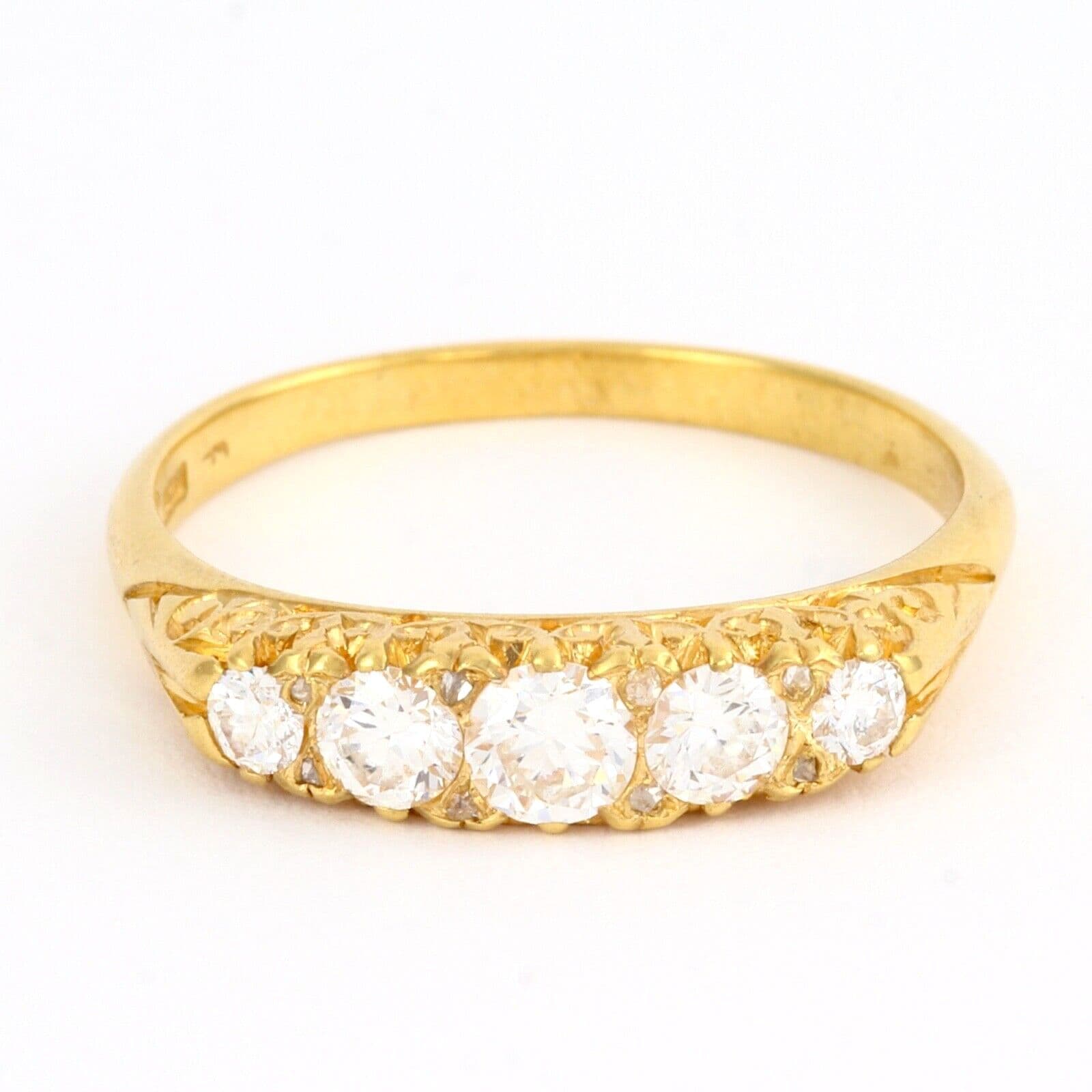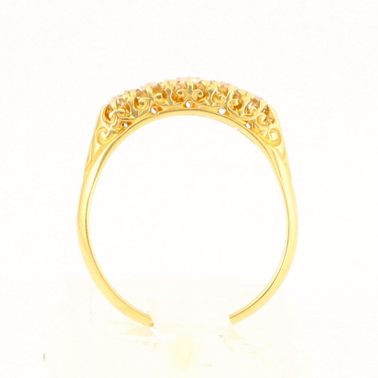 We have on sale this vintage 18 carat yellow gold ring set with five graduated round cut diamonds separated by pairs of tiny rose cut diamonds( the total quantity of rose cut diamonds is 8). The ring has mark 18CT for 18 carat gold . The face of the ring is approx. 4.4mm or 3/16'' at widest part. The diamonds are white, sparkly, very good clarity, eye clean. The central diamond is approx 0.25 carat, two diamonds 0.15 carat each and two diamonds 0.04 carat each by spread. The total carat weight 0.63 excluding the small rose cuts.
