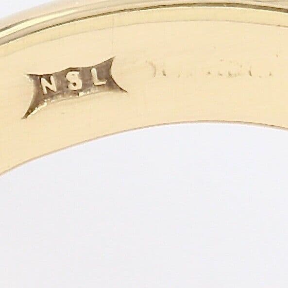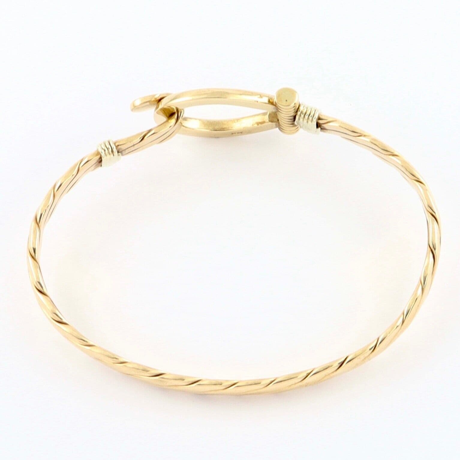 We have for sale this vintage solid 9 carat yellow and white gold tension bangle with hinged hook clasp. The bangle has worn hallmark but has been tested for 9 carat gold.